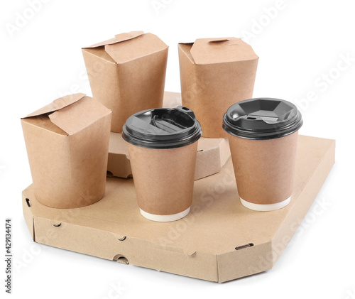 Many food containers and cups on white background