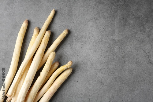 Many raw asparagus spears on grey table, flat lay. Space for text
