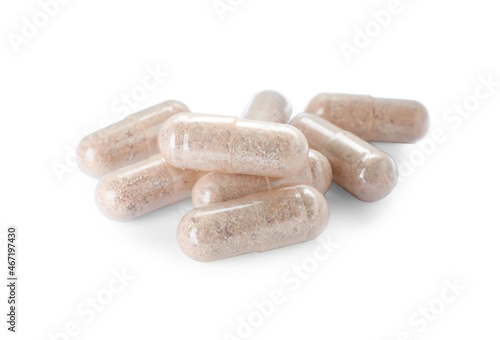 Many transparent gelatin capsules on white background
