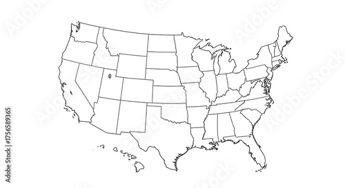 Map of the United States of America with State Borders Outlined in Black and White, Showing Individual States and Their Geographic Divisions