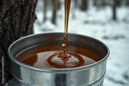 Maple syrup flowing into metal bucket in snowy forest