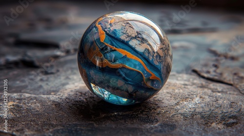 Marble: A small, round glass object used for games or decoration, valued for its smooth texture and variety of vibrant colors and patterns.