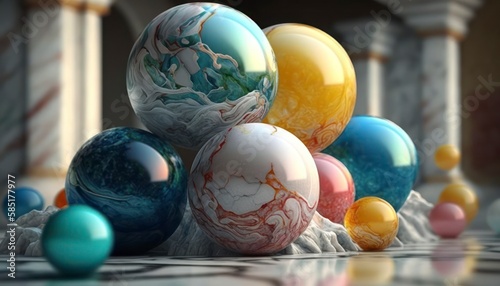 marble balls, different sizes shapes, 3D render game engine unreal, product display space, shiny surface round reflections