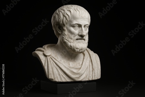 Marble bust of Aristotle on a dark museum plinth with dramatic rim light fine chisel details and classical Greek philosophy portrait in studio