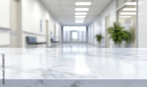 Marble Countertop with Blurred Hospital or Office Hallway Background Template