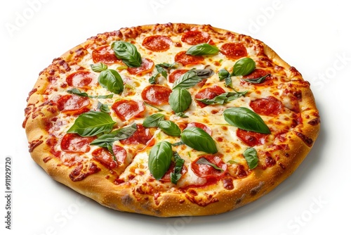 Margherita pizza garnished with fresh basil on white