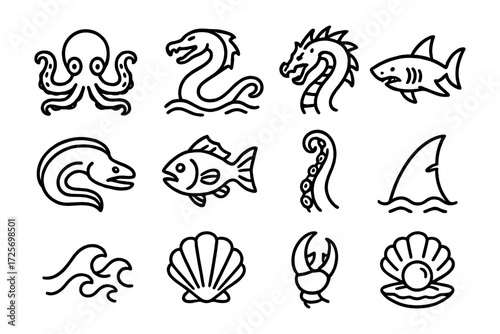 Marine creatures line art collection: octopus, dragon, shark, shells, and more