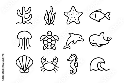 Marine Icon Collection. Marine Ecosystems. Line icon set of Marine Ecosystems: coral, seaweed, starfish, fish, jellyfish, turtle, dolphin, whale, shell, crab,