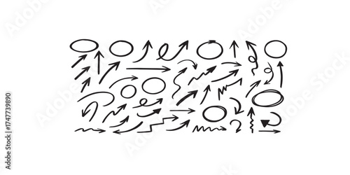 Marker pen doodle arrows and circles vector collection, sketch design elements