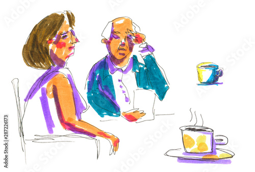 Marker street illustration, sketch, people in street cafe, cartoon style. Isolated on white.
