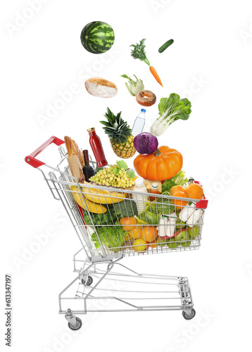 Market assortment. Different products falling into shopping cart on white background