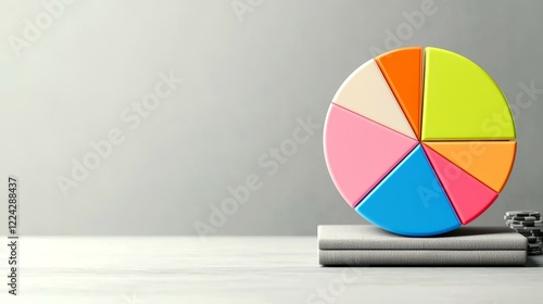 Marketing and Icon concept. Colorful pie chart on a stack of notebooks against a neutral background.