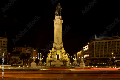 Marques de Pombal statue in the center of the traffic roundabout. Night long exposure with traffic lights blur. Marquis of Pombal Square in Lisbon city center.