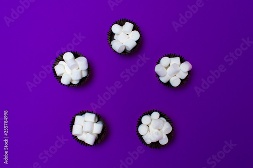 marshmallows in the forms for cakes on a purple background, five pieces. Arranged in a circle. View from above.