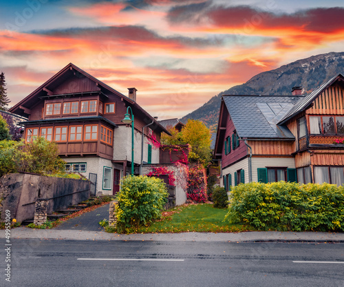Marvelous autumn view of Brauhof village, Styria stare of Austria, Europe. Stunning sunrise in Austrian Alps. Traveling concept background.