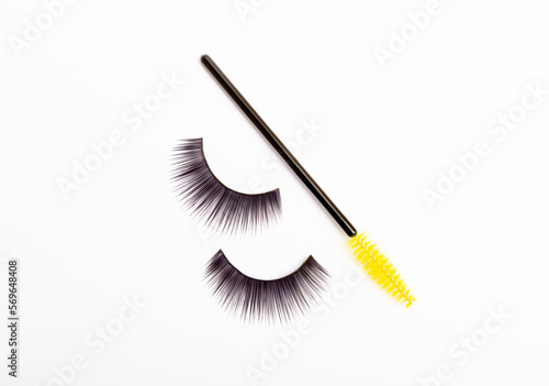 Mascara brushes, makeup brushes, applicators and false eyelashes isolated on white background. Close-up. Brushes for eyelash extensions.