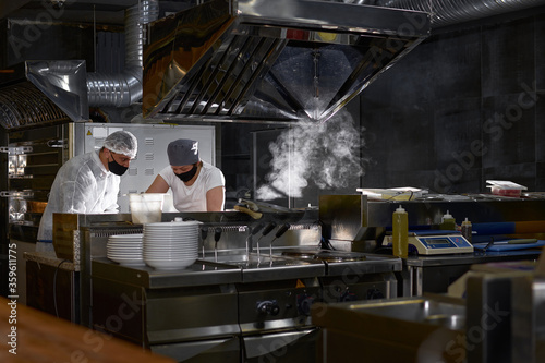 mask on the chef's face in a restaurant: cooks in an open kitchen, a client sees work during a pandemic
