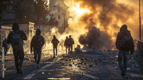 Masked protesters walking through burning street debris during violent demonstrations, silhouetted against intense flames and smoke in urban uprising scene