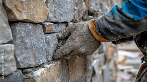 Mason applying mortar for stone wall construction. Featuring expertise and precision