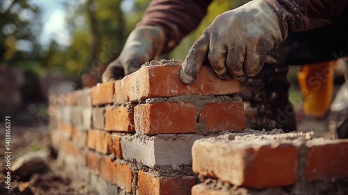 Mason laying bricks for a new outdoor patio. Featuring craftsmanship and focus