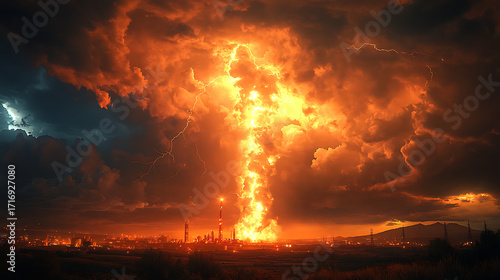 Massive bolt of lightning being absorbed by a high-tech facility surrounded by electric discharge fields