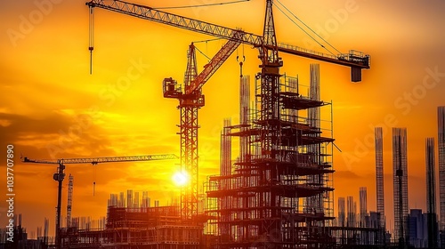 Massive construction site at dusk heavy machinery parked steel beams and scaffolding silhouetted against an orange sky Camera wide shot slightly elevated dramatic lighting