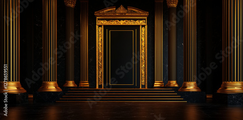 massive grand golden archway with intricate designs and black background creates luxurious and elegant atmosphere. ornate columns and steps enhance opulence of setting