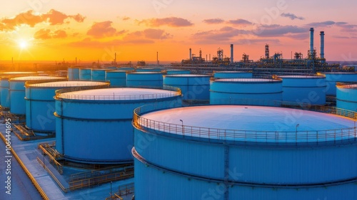 Massive oil storage tanks at a refinery, reflecting sunlight on their metallic surfaces oil storage tanks, refinery infrastructure
