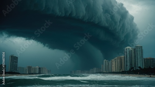 Massive Storm Front Approaching Coastal City With Dramatic Sky and Waves