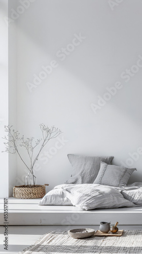Master bedroom in minimalist style with minimal furniture, natural window lighting and neutral tones. Residential interior design composition, Real Estate ad.