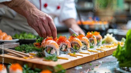 Master Chef Preparing Sushi Rolls in Gourmet Kitchen with Colorful Ingredients