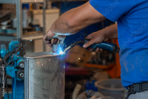 Master replacing of muffler of exhaust system in car workshop. Car pipe