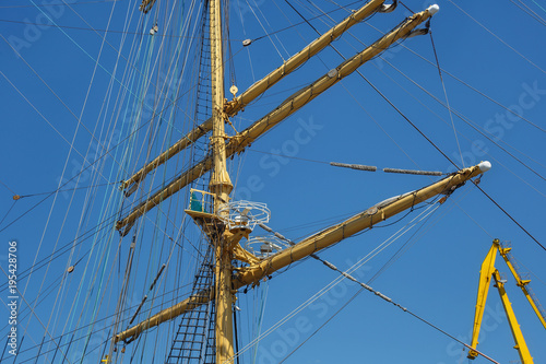 Masts of a sailing ship with the lowered sails with blue sky on the background.