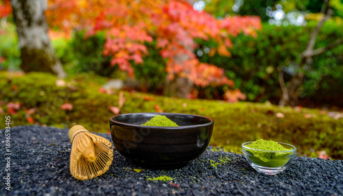 Matcha powder in a black bowl, bamboo whisk, autumn leaves backdrop.