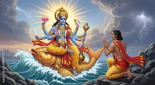 Matsya Avatar of Vishnu – Divine Fish Incarnation Guiding Sages Through the Great Flood. Matsya Avatar of Vishnu – Mythological Beach Scene with Devotees and Sacred Rituals.