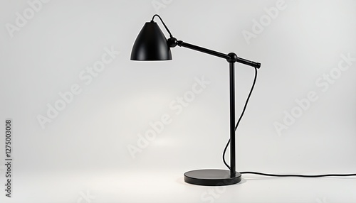 Matte Black Desk Lamp on White Background: Stylish Reading Light with Wire Base. A black desk lamp on a white background.