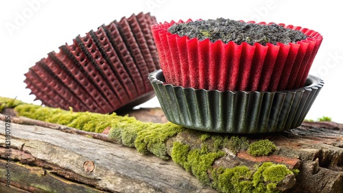 Matte-textured muffin tin scrubbers in ruby red, obsidian black, mossy bark, and low-light waves.