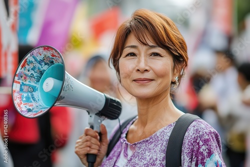 Mature Asian woman holding megaphone at protest.