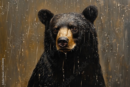 Mature Black Bear in Rain with Drenched Fur Against Dark Background, Capturing the Essence of Wildlife and Nature in a Stunning Portrait with Detailed Expressions