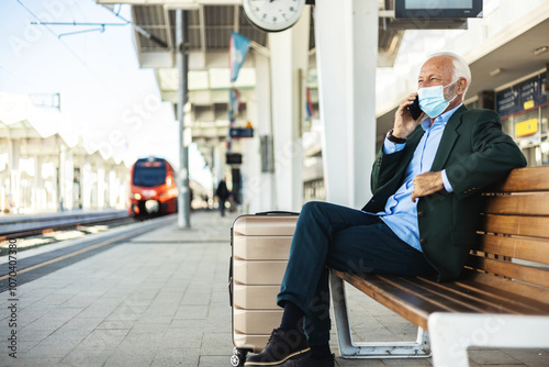 Mature businessman wearing protective face mask while talking on the phone, waiting for a train at train station.