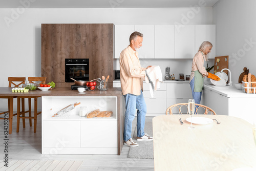 Mature couple washing dishes in kitchen
