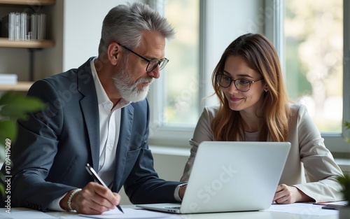 Mature focused senior mentor leader man showing young woman manager project on laptop in modern office. Two partners, team of professional business people working, studying, writing notes sit at desk