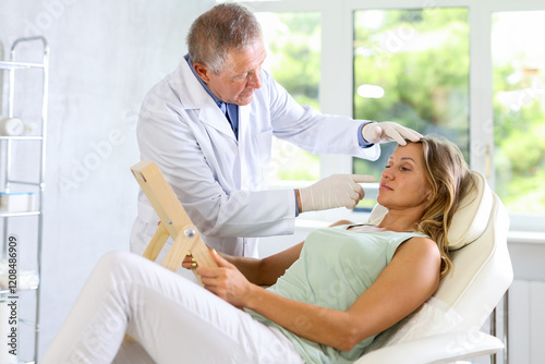 Mature man cosmetologist examines middle-aged female patients face after lifting procedure and gently palpates touches skin with finger