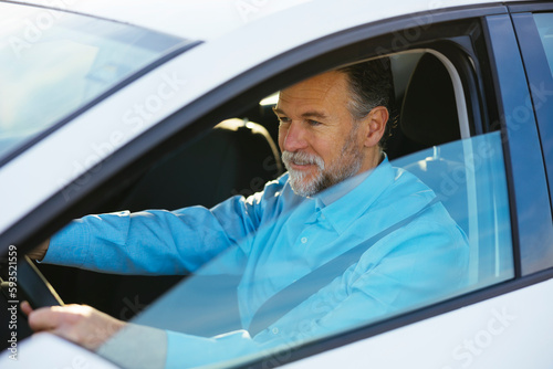 Mature man driving car seen through window