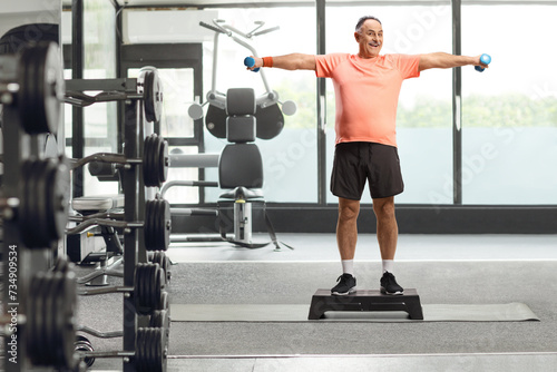 Mature man exercising step aerobic and holding dumbbells at the gym