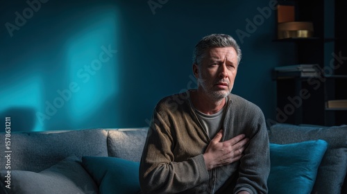 Mature man experiencing chest pain while sitting on a sofa.