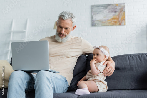Mature man holding laptop and embracing baby girl on couch