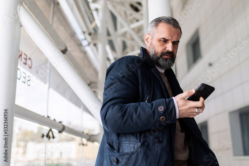 mature man waiting for boarding a flight at the airport looking at his mobile phone