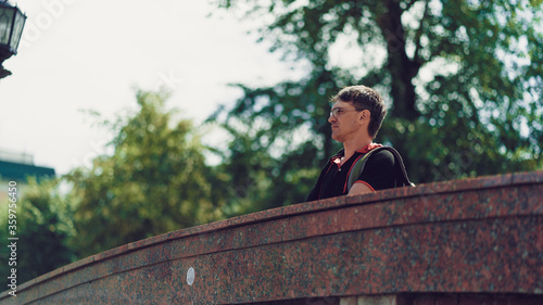 Mature man with glasses looking away, standing on bridge. Adult male enjoying view from bridge, looking at sights.
