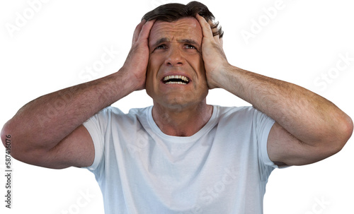 Mature man with head in hands suffering from headache